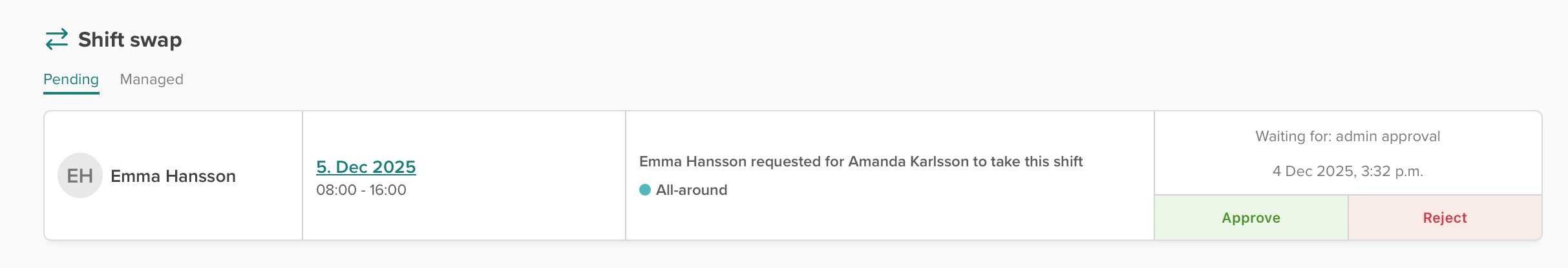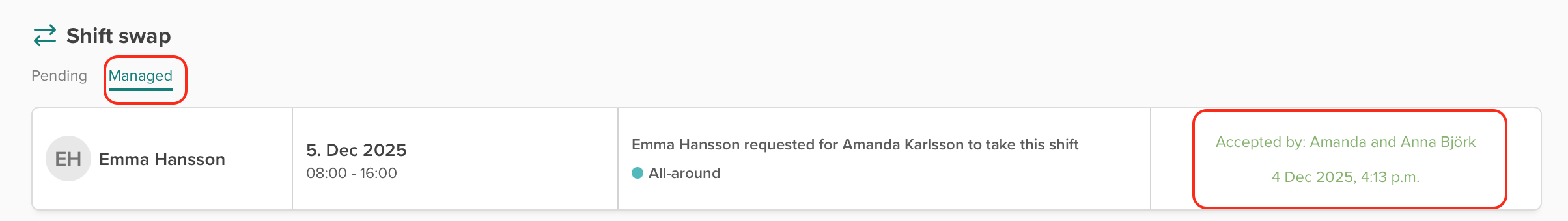 You can now approve or decline the shift swap. If you approve the shift swap, it will be registered immediately, and you will then be able to see under "managed" that the shift swap has been approved both by you as the admin and by Amanda, who was the employee set to take over the shift: