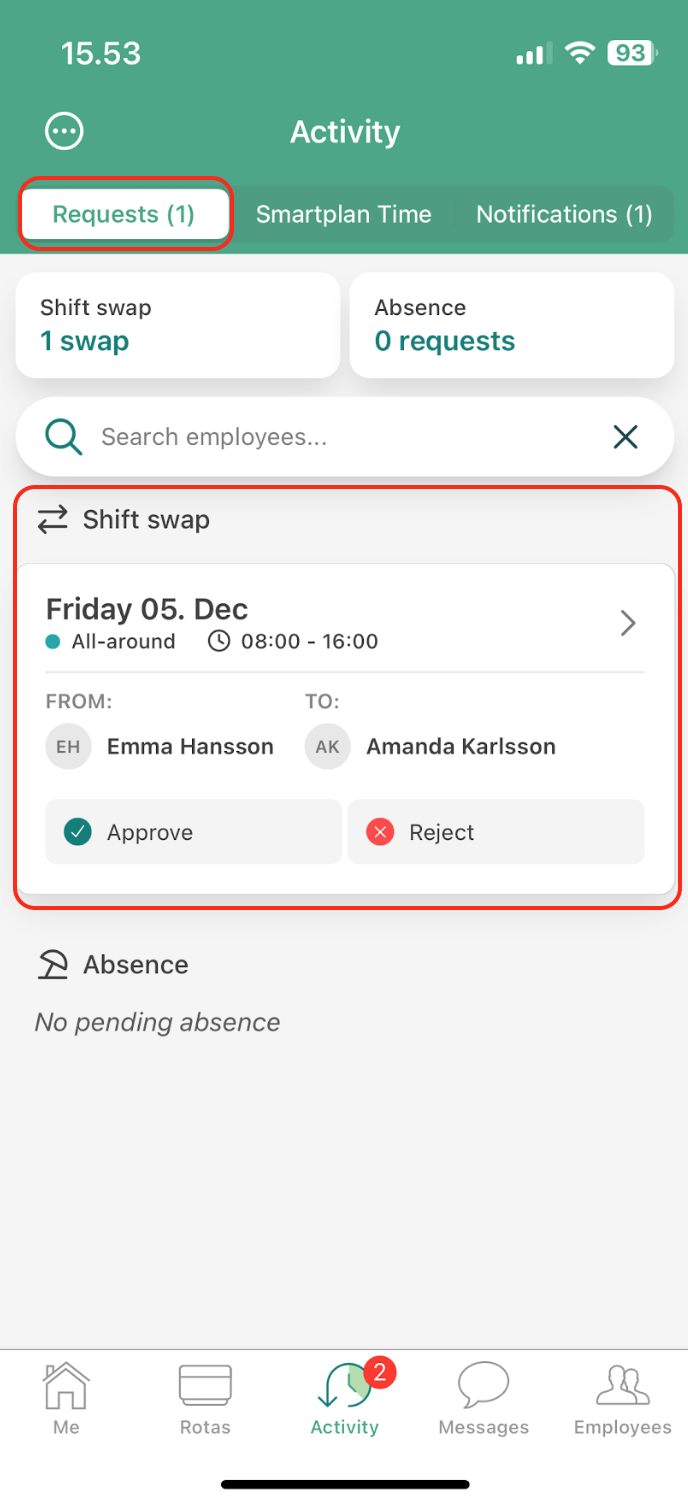 In addition to handling shift swaps on your computer, you can also approve or decline shift swap requests directly from the Smartplan app.